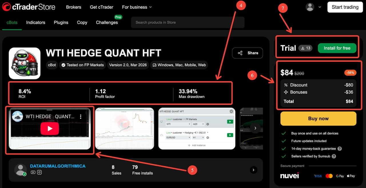 WTI HEDGE QUANT HFT is presented as an algorithmic scalping/arbitrage cBot, tested on FP Markets, with Version 2.0 dated March 2026. Its product page shows 8.4% ROI, 1.12 profit factor, and 33.94% max drawdown, and it also displays trial availability plus free installs. (ctrader.com)