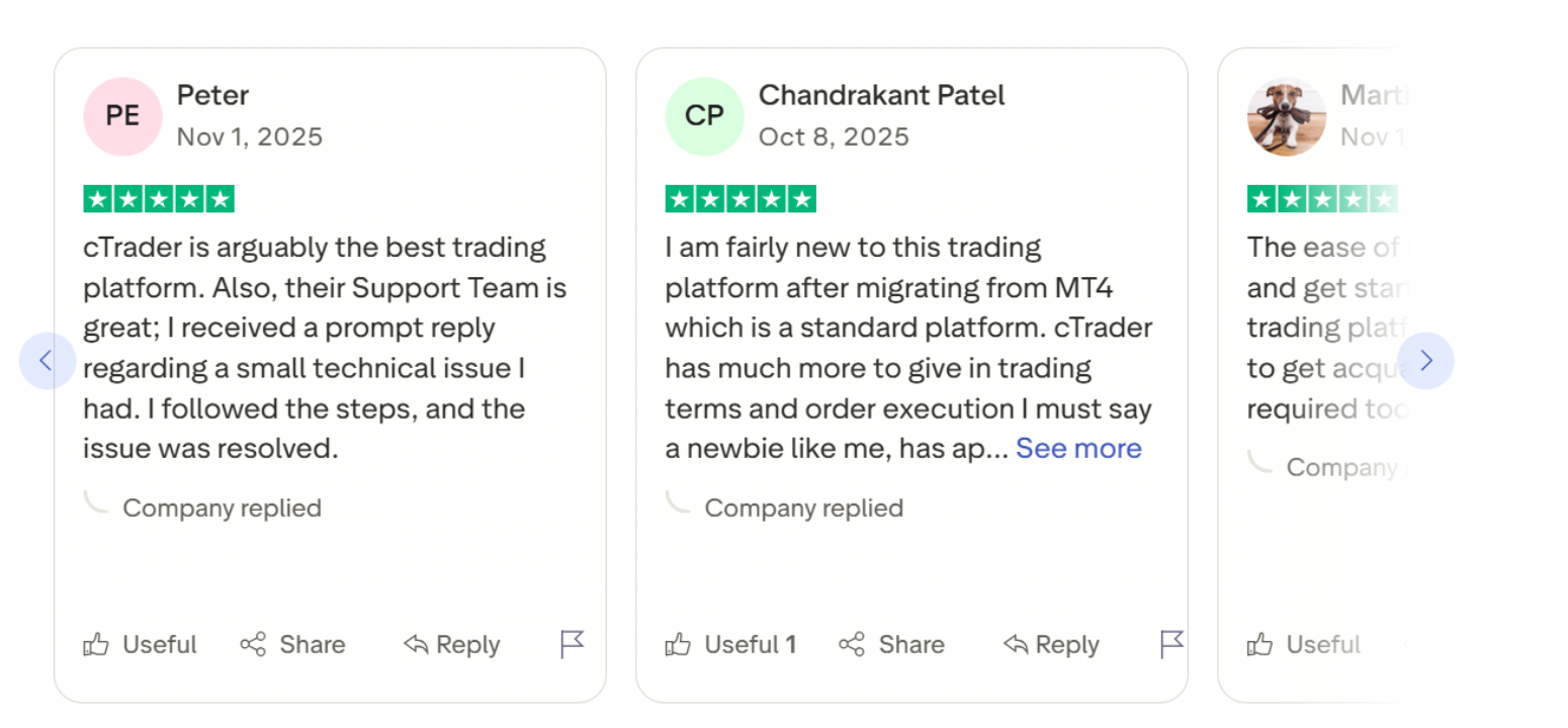 Trustpilot feedback shows that traders value cTrader for its smooth and responsive performance, as well as for its clean and intuitive interface that supports efficient navigation and trade placement.