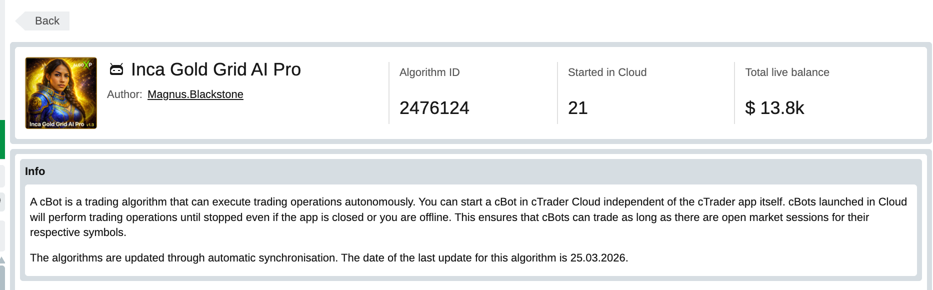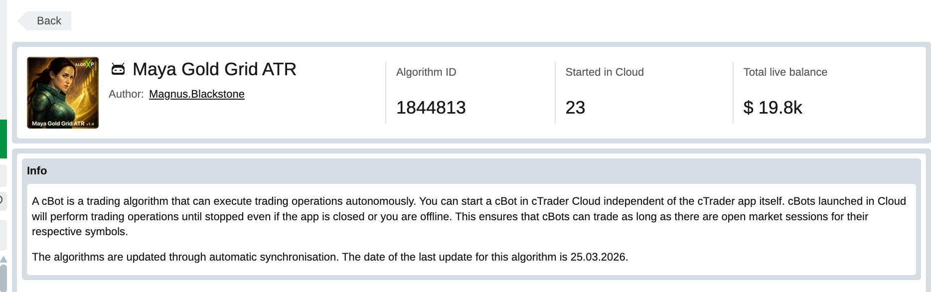 Another reason this case stands out is the level of trust behind it. In the Algo section, you can already see meaningful live capital allocated to these bots in cTrader Cloud alone: roughly $19.8k for Maya and $13.8k for Inca at the time of writing. And that is only the cloud side. Based on local launches as well, the real figure is likely several times higher.