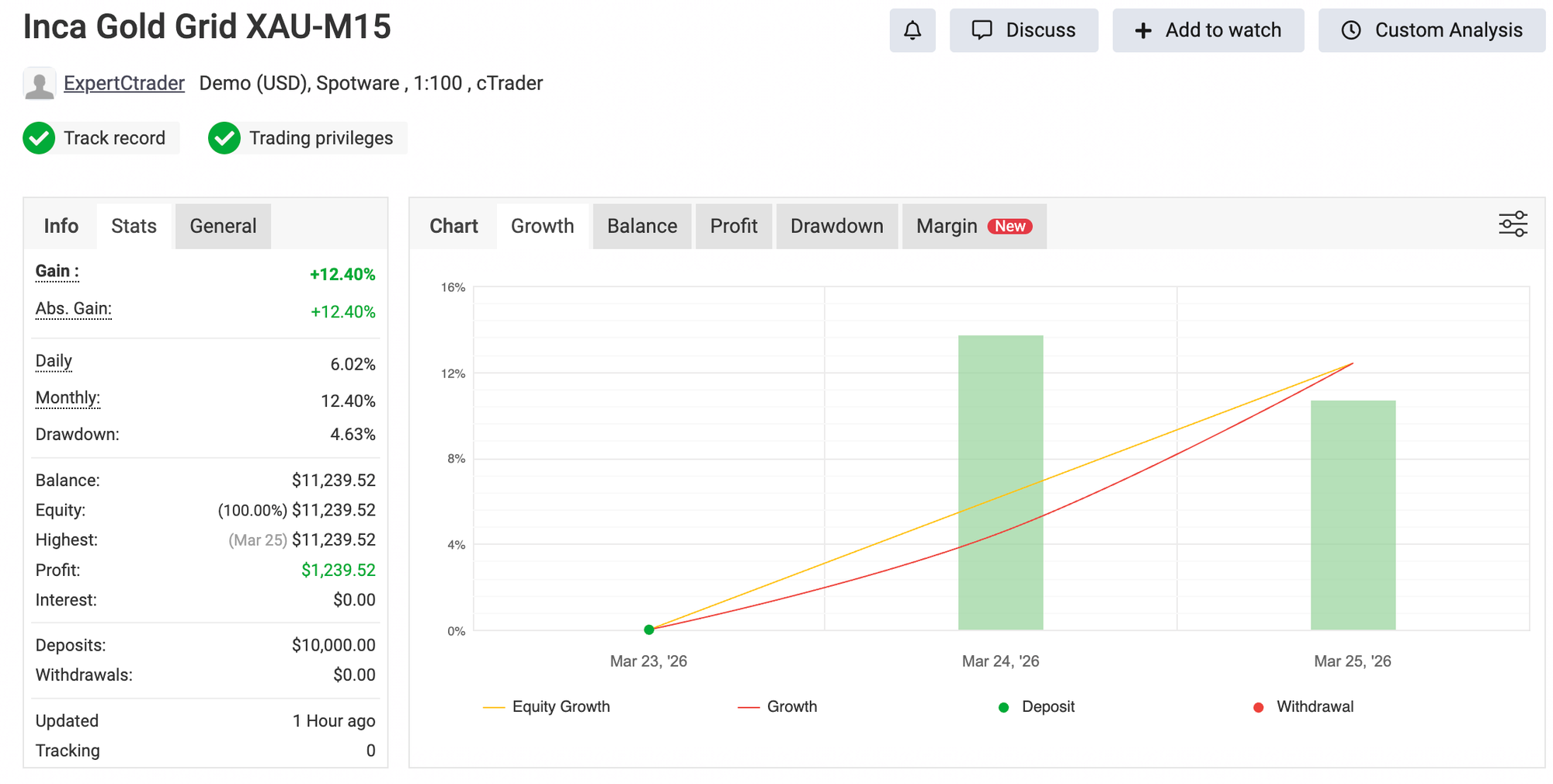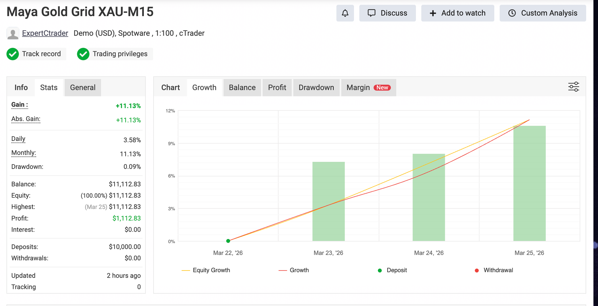 Instead of debating a chart in isolation, we launched optimised versions of the bots on Spotware demo accounts and published the runs on Myfxbook — one of the most popular platforms traders use to track and verify trading results. That gave us something far more useful than a polished historical curve: a live view of how the strategy logic responds to current market stress in real time.