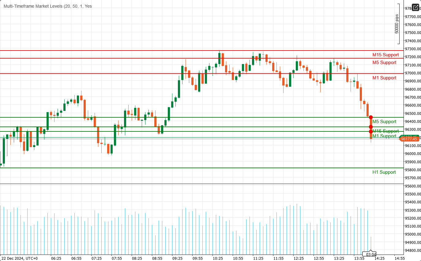 Multi-Timeframe Market Levels is an indicator shows support and resistance levels from several timeframes on a single chart and creates a clear hierarchy of zones that matter most. It helps traders understand where price is likely to react by combining higher‑timeframe context with intraday structure.